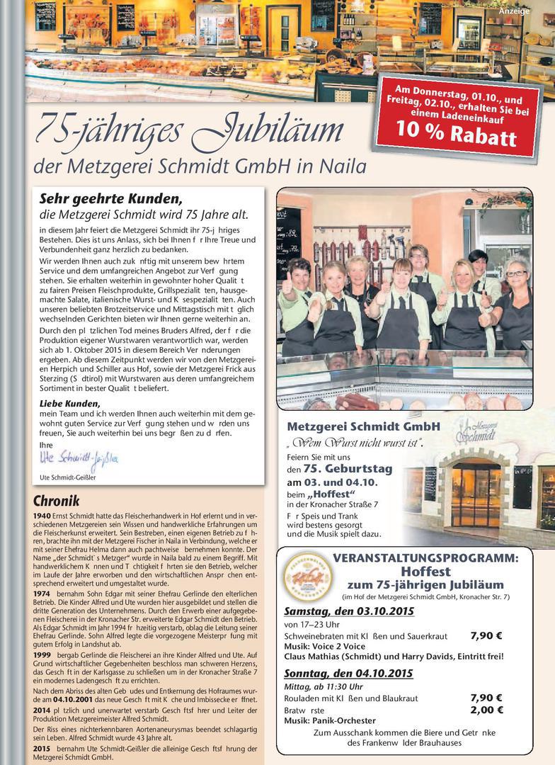 Seit 1940 gibt es in Naila den „Schmidts Metzger“. Ernst Schmidt, der in Hof das Metzgerhandwerk erlernte, eröffnete hier seine erste eigene Metzgerei.